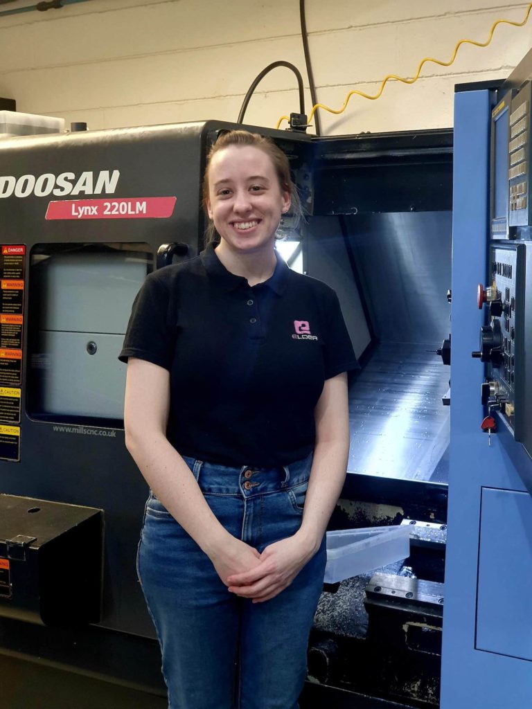 Following on from completing her BTEC L3 Diploma, Rebecca chose to work in the turning department, where she is now a valuable part of the Elder team tackling all aspects of Multi-Axis, Multi Spindle Lathes and also not in need of her step!